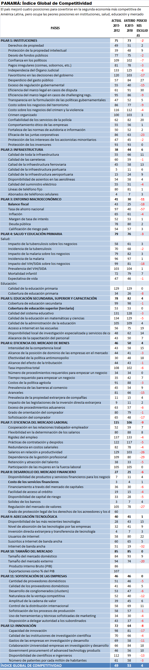 Panamá tuvo una mejoría en el Índice Global de Competitividad (IGC), pasando de la posición número 53 a la 49. De acuerdo con el índice, el país logró la segunda mejor posición en Latinoamérica, después de Chile, el cual logró la posición 31. Esto implica que Panamá es el segundo país más competitivo de América Latina. Sin embargo, el resultado es paradójico porque, a pesar de la mejoría, el país siguió ocupando las peores posiciones del mundo en el tema de instituciones, salud, educación, mercado de trabajo y educación. Concretamente, el interesante informe, que sin lugar a duda es la radiografía de la situación económica, social e institucional del país, revela que Panamá está avanzando en términos de competitividad gracias a la inversión extranjera que ha estado trayendo prosperidad, pero que nos mantenemos estancados internamente en términos de las políticas públicas de educación, salud, innovación y, sobre todo, en el desarrollo de las instituciones y la administración pública.