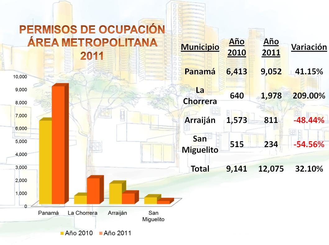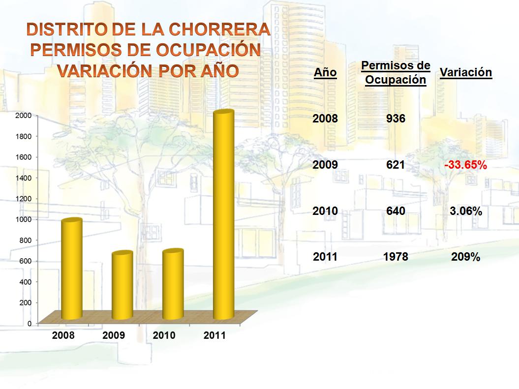 De los distritos metropolitanos podemos señalar que en el Distrito de La Chorrera se otorgaron 1,978 permisos de Ocupación con un aumento porcentual del 209%, en comparación del 2.97% de lo tramitado en el 2010, este es uno de los mayores crecimientos porcentuales que hemos visto en los últimos años.