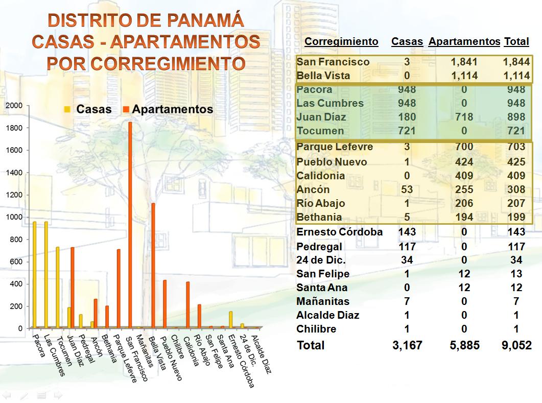 Como hemos mencionado, en los corregimientos más al centro de la ciudad, como San Francisco y Bella Vista se construyen principalmente apartamentos, y representan el 33% de las construcciones. Vemos también como en Parque Lefevre, Pueblo Nuevo, Calidonia, Ancón, Río Abajo y Bethania tienen una marcada tendencia a la construcción de apartamentos.