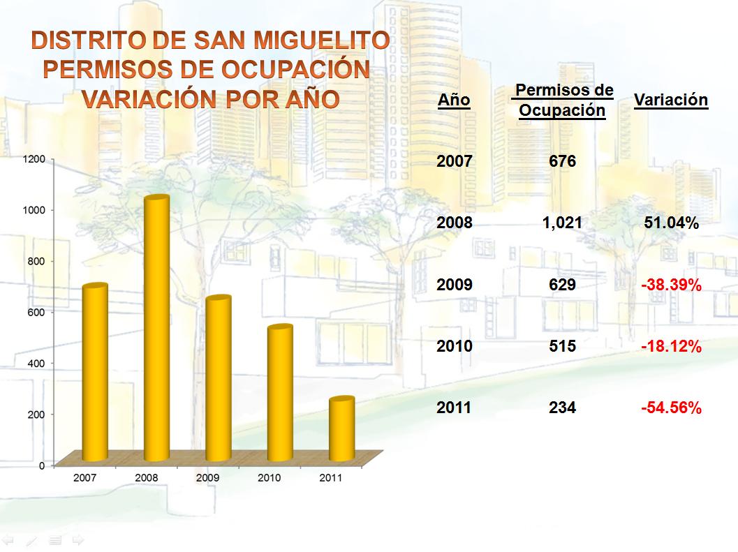 Aquí comparamos los permisos de ocupación desde el año 2007, hasta el 2011, y notamos que entre el 2007 y el 2008 hubo un crecimiento del 51%, y para el período 2008 al 2009 una disminución sustancial del más del 38%. Y entre el 2010 y el 2011 nuevamente una disminución del -54.56%.