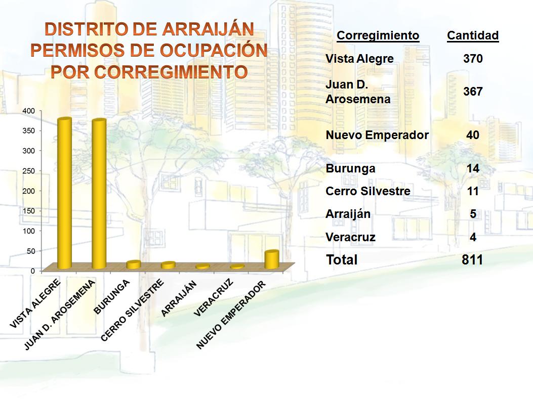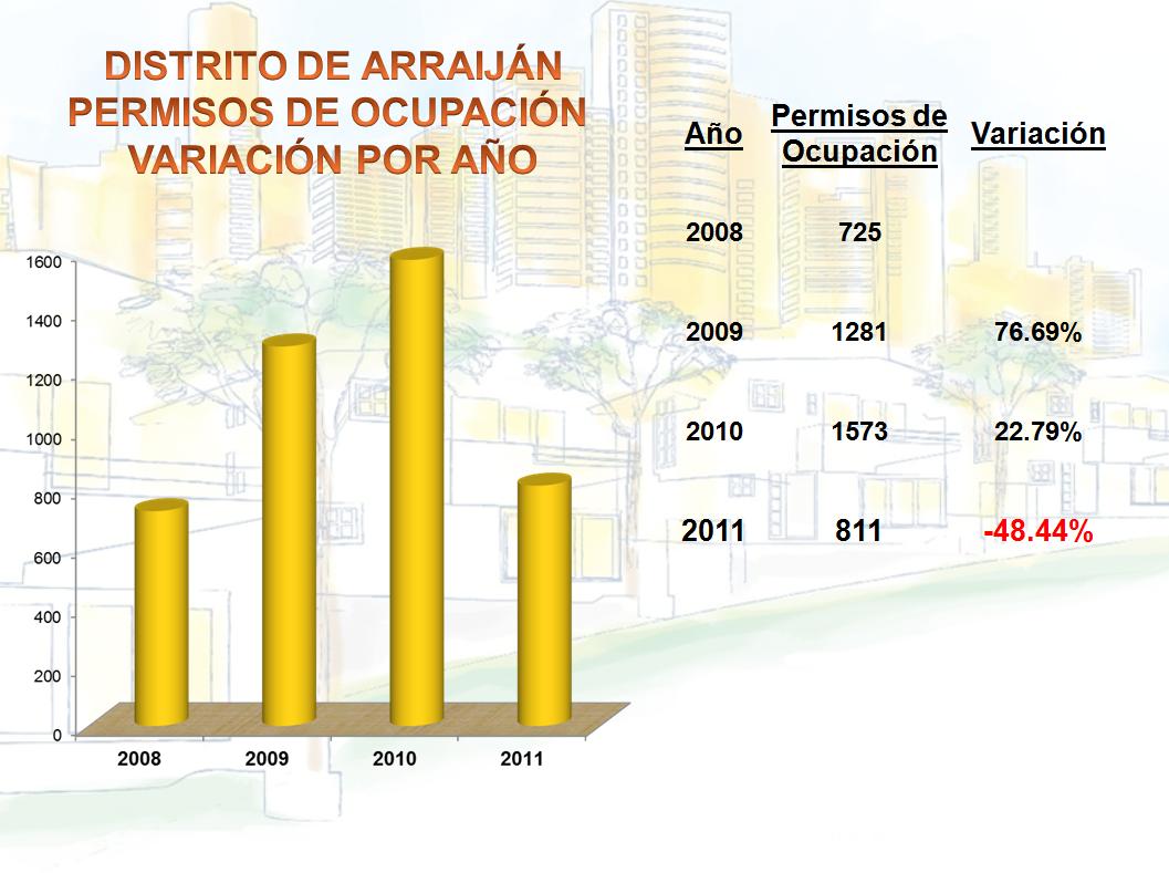 Arraiján ha sido la sorpresa de este estudio, y aunque en el 2009 obtuvo casi 77% de incremento en cantidad de permisos de ocupación; y en el 2010 aproximadamente 23%; para el 2011 decrece y tiene una variación de más de -48%.