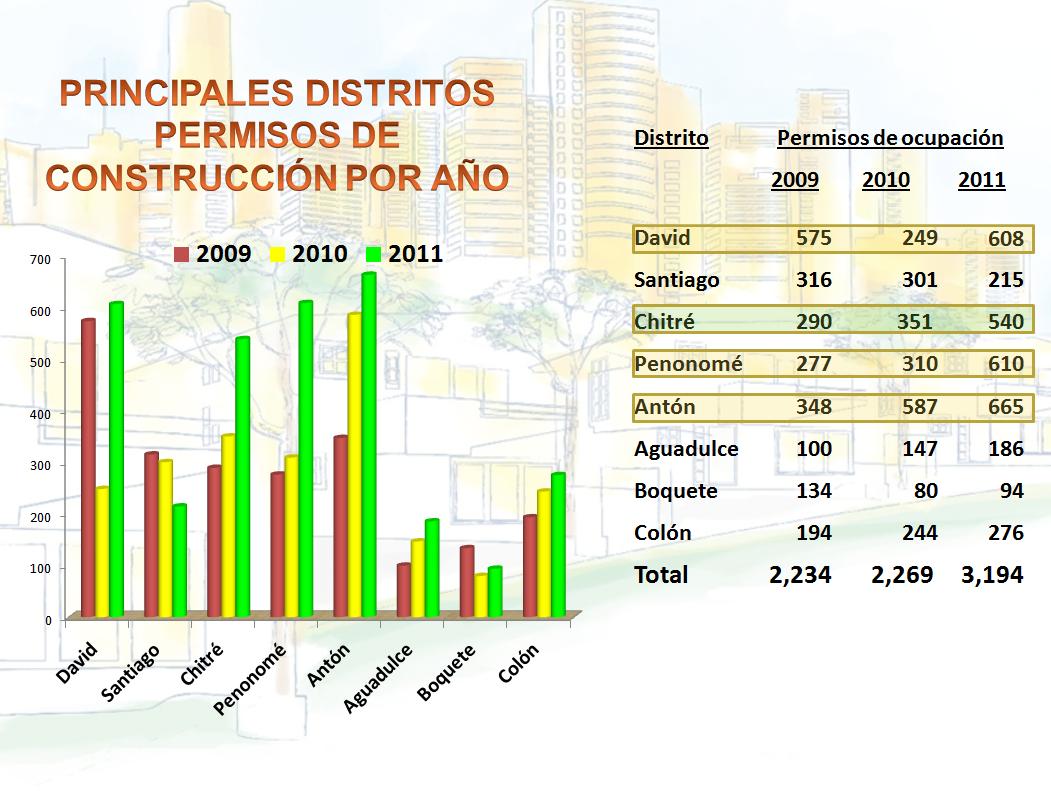 En primer lugar Antón con 665 viviendas, que muestra un, aumento de 10% con relación al año 2010, y que está basado en proyectos de playa. El Distrito de Penonomé ocupa el segundo lugar desplazando a David en esa posición con 610 permisos, pero seguido muy de cerca de los Chiricanos con 608. Chitré con 540 soluciones, con un crecimiento de 97% con relación al año 2010. Le sigue Colón con 276 permisos de ocupación, Santiago con 215, que disminuye en comparación al año pasado un 29%. Aguadulce con 186 creció 20% y Boquete con 94 mostró un incremento con relación al año anterior.