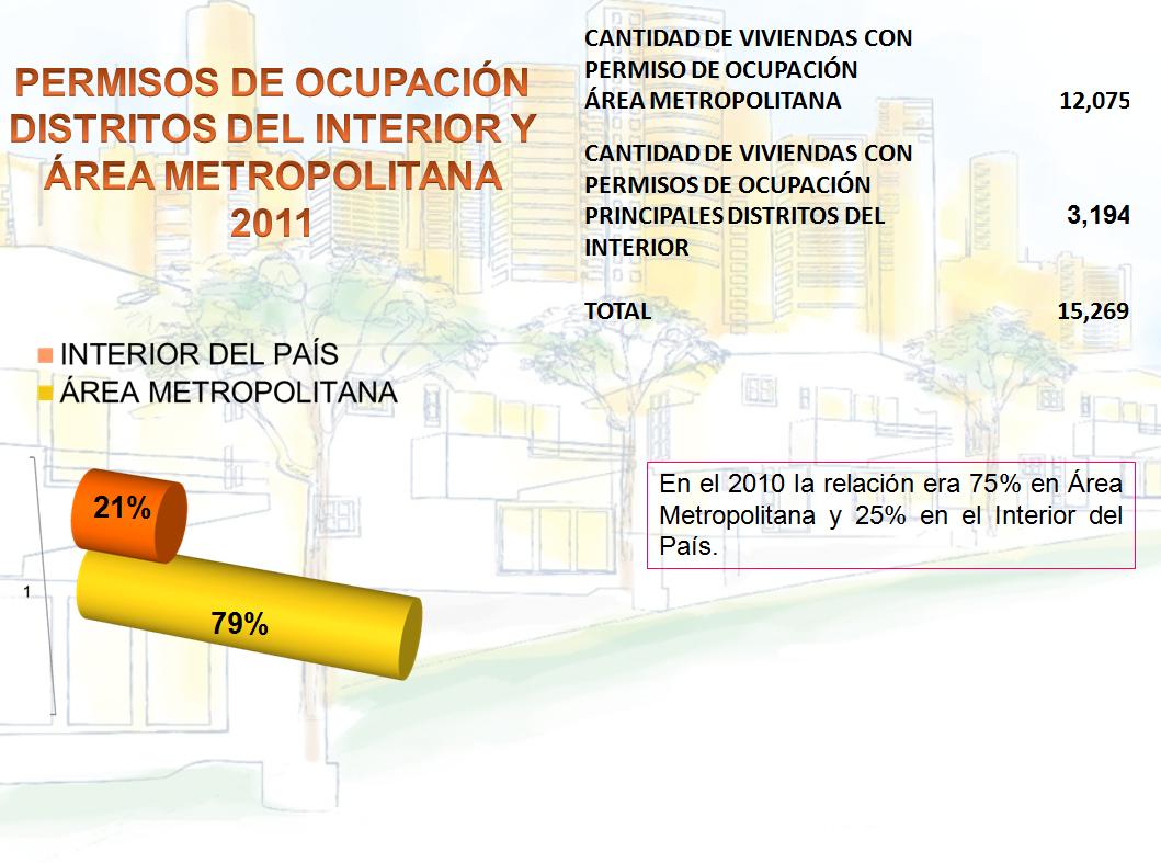 En total tramitaron permisos de ocupación 15,269 viviendas, de las cuales el 79% pertenecen al área metropolitana y el 21% al interior. Con una disminución en las proporciones con relación al 2010. Sin embargo la cantidad de viviendas construida a nivel nacional en 2011 aumento 25% en comparación con el 2010. Este aumento se refleja tanto en el interior como en los distritos metropolitanos.