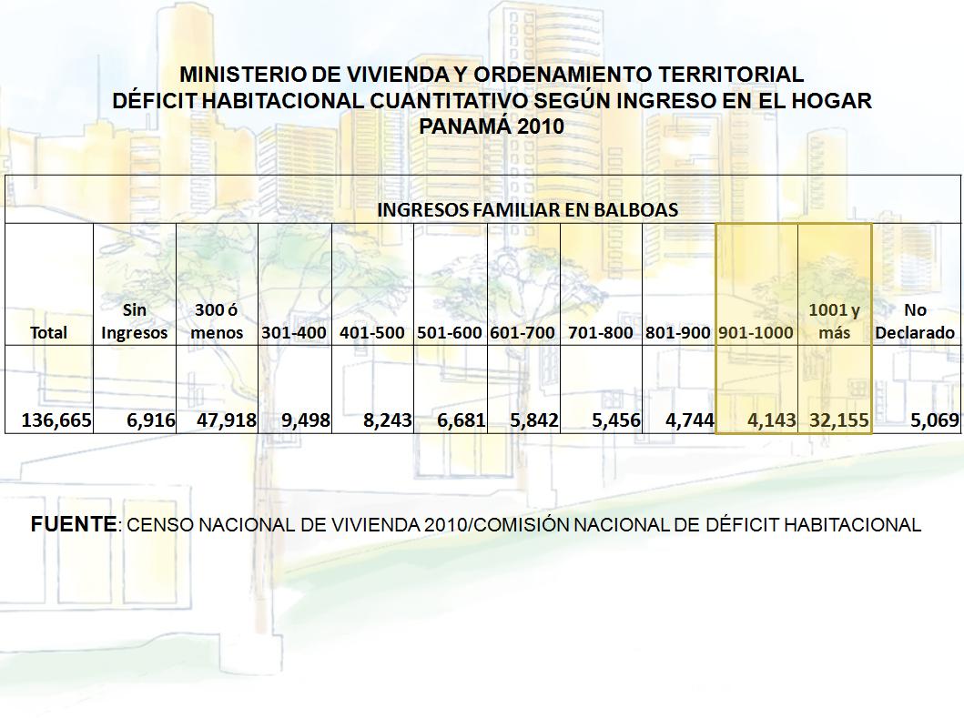 Nos toca hablar ahora un poco sobre la Demanda Nacional de Viviendas, basados en el Déficit Habitacional, que fue estudiado en el 2011 en la Comisión instalada para tal fin, con la participación del Miviot, la Contraloría General de la Nación, el PNUD, Capac y Convivienda. Esta comisión se basó en el e Censo de Población y Vivienda 2010, de una forma cuantitativa y cualitativa, pudiendo establecer la verdadera necesidad de soluciones habitacionales de la población.