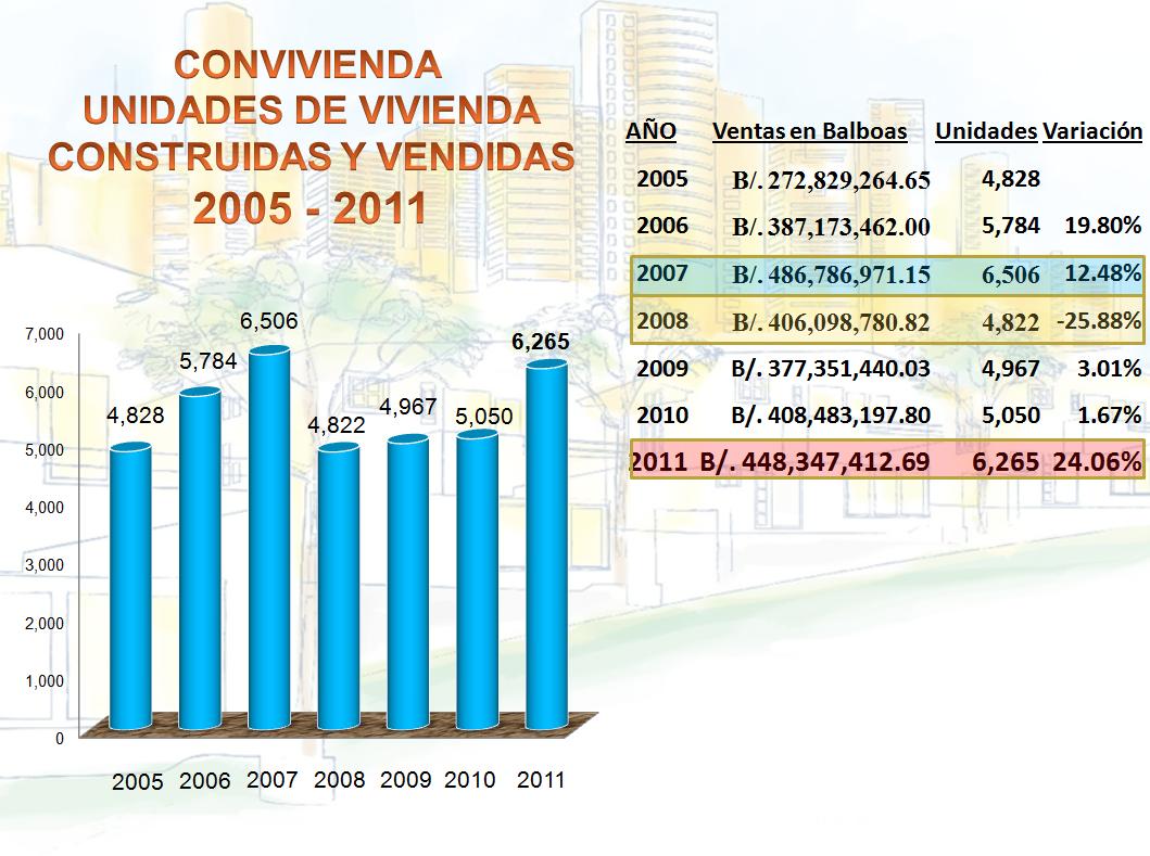 En el 2009 y pese a ser una año electoral, se pudo crecer 3.01%, y en el 2010 crecimos casi un 2%. Lo importante del 2011 es que estamos al nivel de ventas del 2007, que como a hemos mencionado, es el mejor año que se tiene registrado hasta ahora. Convivienda ha tenido para el 2011 un crecimiento porcentual de 24.06%. Esto nos lleva a concluir, que con creatividad y esfuerzos denodados tanto de los inversionistas como de las políticas gubernamentales, se puede lograr mantener los niveles de crecimiento razonable y necesario, para que ese déficit habitacional que vimos hace unos minutos no solo se detenga, sino que disminuya. No puede existir paz y bienestar en una sociedad en que sus ciudadanos no vivan de forma digna.