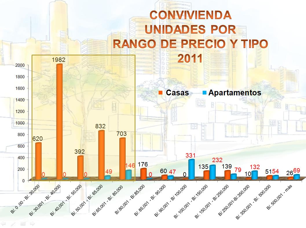 2. La mayor cantidad de viviendas que se estima se construirán están en el rango entre B/.30, 001 hasta B/.80,000.00. Creemos que la revisión de las normas de construcción para viviendas económicas, así como el bono de B/.5,000.00 para la compra de viviendas de hasta B/.30,000.00 ha sido un incentivo para la construcción en este rango de precios, pero deberá pasar al siguiente nivel de ingreso para que pueda ser efectivo en el 2012, es por ello que es vital que se aprueba la reforma a la Ley de interés preferencial que aún sigue en segundo debate de la Asamblea Nacional después de casi 2 meses.