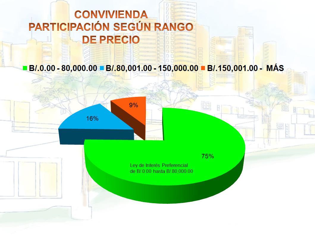 Se detalla ahora la participación de Convivienda según rango de precio. Entre B/.0.00 y B/.80,000.00, se desarrollan el 75% de nuestras construcciones. En este rango se encuentra las soluciones habitacionales incluidas en la Ley de Interés Preferencial. Luego podemos apreciar que en el rango hasta B/.150,000.00 Balboas, tenemos una participación del 9%; y, finalmente, el rango más alto que incluye valores por encima de B/.500,000.00 Balboas mantiene un 16%.