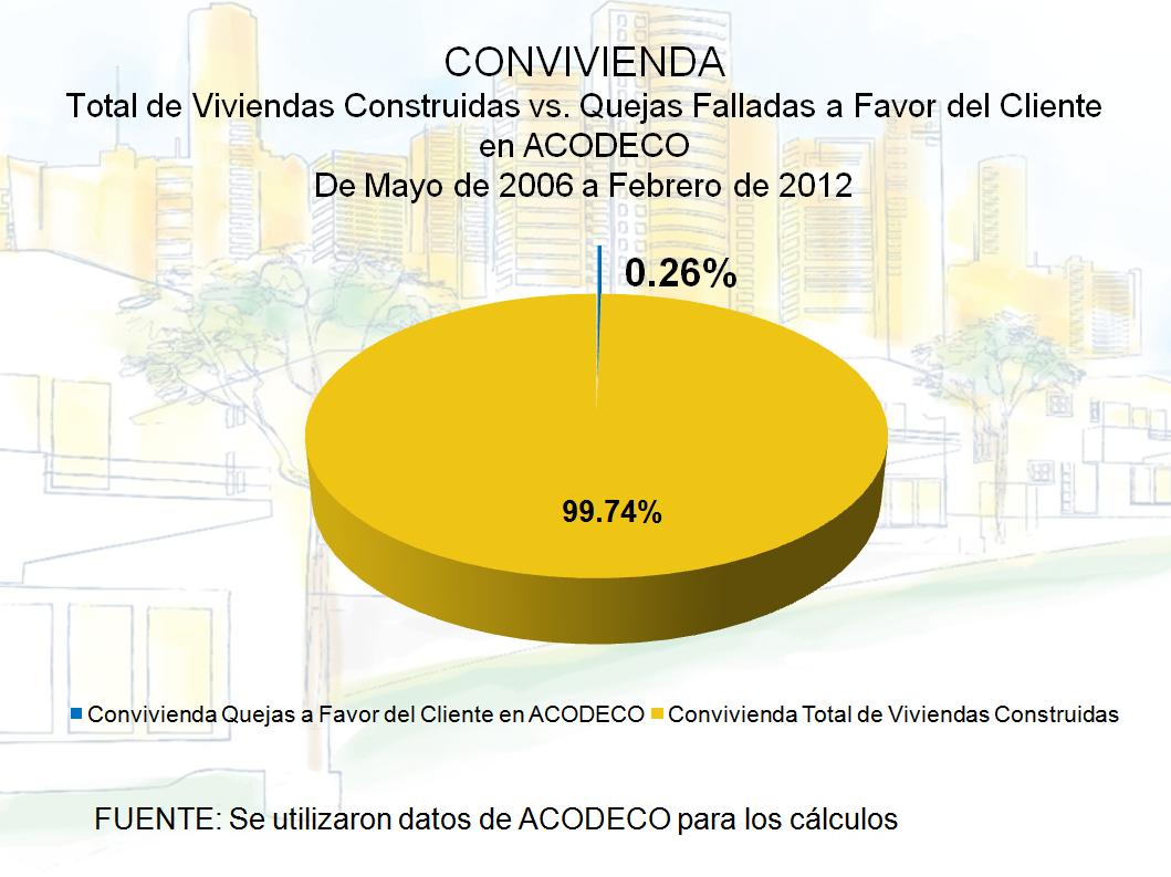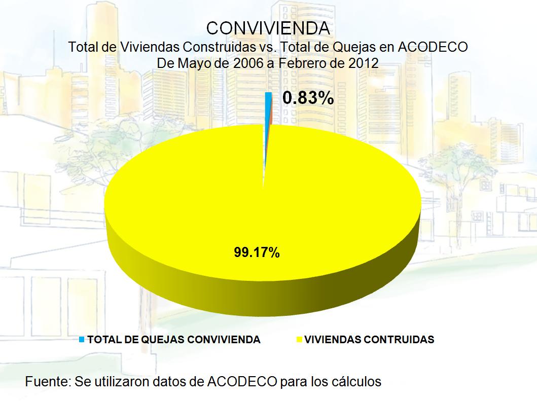 Del total de quejas presentadas en Acodeco de mayo de 2006 hasta febrero de 2012, comparadas con las viviendas construidas por los agremiados en Convivienda en ese mismo lapso de tiempo, observamos que tan solo 0.83% eran quejas presentadas a nuestros promotores. Si lo ven en la gráfica es la pequeña línea azul en el inmenso pastel amarillo. Para obtener estos cálculos utilizamos las cantidades que aparecen en la página web de Acodeco.